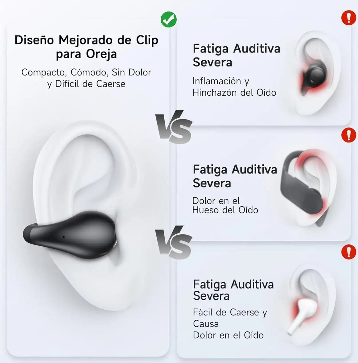 Audífonos de conducción ósea tipo clip-on: cómodos, ligeros y con sonido nítido sin taparte los oídos. Perfectos para hacer ejercicio, caminar, trabajar y mantenerte conectado con tu entorno.